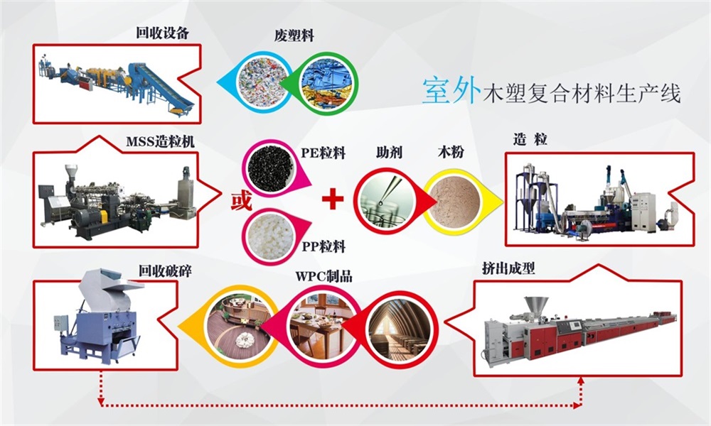 木塑復(fù)合材料的生產(chǎn)工藝主要采用兩個(gè)步驟: 造粒機(jī)——成型機(jī)。它是一種由塑料樹脂和木粉混合而成的復(fù)合材料。優(yōu)點(diǎn): 快捷混合、塑化分散、快捷除濕、產(chǎn)量大。也可用于PP、PE、PS、ABS等木塑材料的注塑成型。