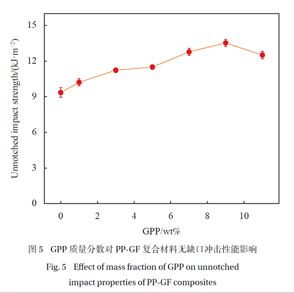 圖5顯示,隨著GPP添加量從0wt%增加至9wt%,無(wú)缺口沖擊性能逐步提升,最佳效果出現(xiàn)在9wt%處,隨后略有下降。這表明GPP有效改善了玻璃纖維與聚丙烯的界面相容性,提升了復(fù)合材料的抗撞擊能力。但過(guò)量添加GPP會(huì)削弱聚丙烯分子鏈間的相互作用,導(dǎo)致沖擊性能下降。