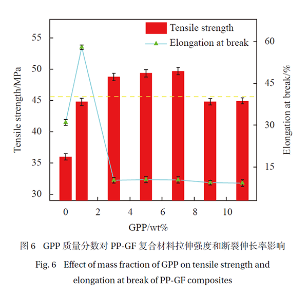 圖7顯示,隨著GPP含量的增加,PP-GF復(fù)合材料的彎曲強(qiáng)度和彎曲模量持續(xù)上升,直至7wt%時(shí)達(dá)到最優(yōu)。這歸因于GPP增強(qiáng)了界面強(qiáng)度,穩(wěn)定了玻璃纖維在聚丙烯基體中的分布,從而提高了復(fù)合材料的承載性能。然而,GPP含量超過(guò)7wt%后,聚丙烯分子鏈間的相互作用減弱,導(dǎo)致彎曲強(qiáng)度下降。