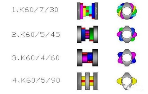 ● 在進行聚合物混合時,喂料塑化混合段由一個或兩個中等寬度甚至更寬的右旋嚙合盤以及平直嚙合塊KB組成,而整段還含有一個或者兩個左旋螺紋嚙合塊;