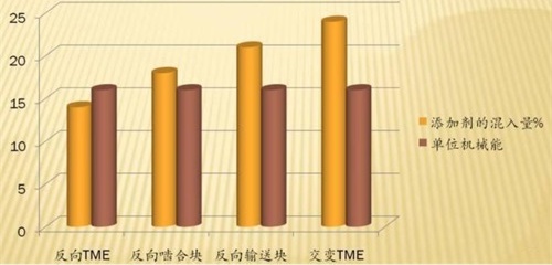 ● 用嚙合塊結(jié)構(gòu)的螺桿能混入添加劑的量小于任何一種TME結(jié)構(gòu)螺桿;