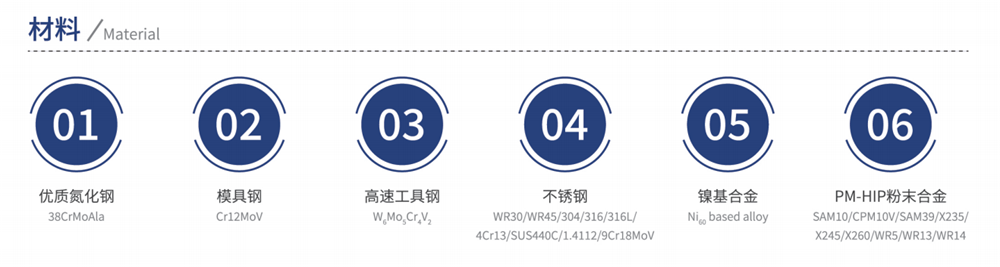 ● 采用歐洲HIP工藝加工的粉末高速鋼,并嚴(yán)格按對方熱處理工藝處理的元件。